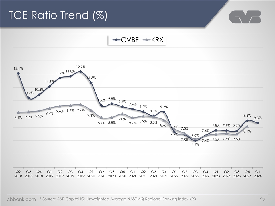 CET1 Ratio Trend (%) 17.1% CVBF KRX 15.1% Community 14.9% 14.9% 14.9% 14.9% 14.8% 14.8% Bank Q3’18 14.6% Suncrest 14.6% 14.6% 14.5% 14.4% Q1’22 14.3% 14.1% 14.1% 13.8% 13.8% 13.6% 13.6% 13.5% 13.4% 13.0% 12.9% 12.8% 12.8% 12.8% 12.5% 12.5% 12.2% 12.2% 12.1% 12.1% 12.1% 12.0% 12.0% 12.0% 12.0% 12.0% 12.0% 11.9% 11.9% 11.8% 11.8% 11.8% 11.7% 11.7% Q2 Q3 Q4 Q1 Q2 Q3 Q4 Q1 Q2 Q3 Q4 Q1 Q2 Q3 Q4 Q1 Q2 Q3 Q4 Q1 Q2 Q3 Q4 Q1 2018 2018 2018 2019 2019 2019 2019 2020 2020 2020 2020 2021 2021 2021 2021 2022 2022 2022 2022 2023 2023 2023 2023 2024 * Source: S&P Capital IQ. Unweighted Average NASDAQ Regional Banking Index KRX cbbank.com 21