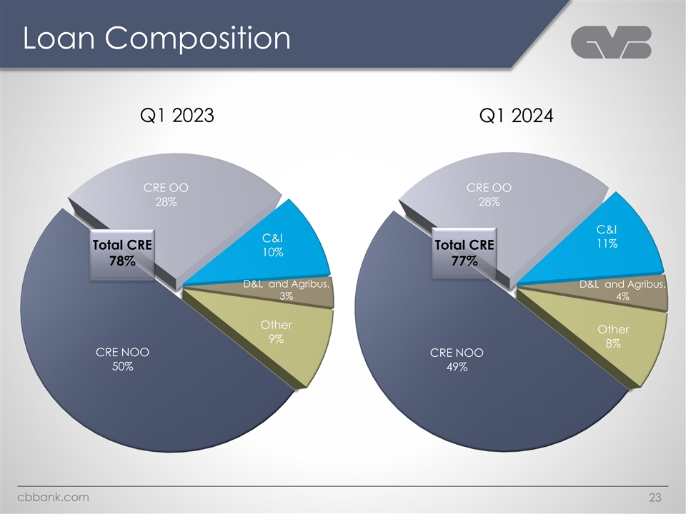 TCE Ratio Trend (%) CVBF KRX 12.2% 12.1% 11.8% 11.7% 11.3% 11.1% 10.5% 10.2% 9.8% 9.6% 9.6% 9.4% 9.2% 9.2% 9.7% 9.7% 8.9% 9.6% 9.4% 9.3% 8.5% 9.2% 9.2% 9.1% 8.3% 9.0% 8.9% 8.8% 8.8% 8.7% 8.7% 8.6% 7.8% 7.8% 7.7% 7.7% 7.5% 7.4% 8.1% 7.9% 7.0% 7.5% 7.5% 7.5% 7.5% 7.4% 7.1% Q2 Q3 Q4 Q1 Q2 Q3 Q4 Q1 Q2 Q3 Q4 Q1 Q2 Q3 Q4 Q1 Q2 Q3 Q4 Q1 Q2 Q3 Q4 Q1 2018 2018 2018 2019 2019 2019 2019 2020 2020 2020 2020 2021 2021 2021 2021 2022 2022 2022 2022 2023 2023 2023 2023 2024 * Source: S&P Capital IQ. Unweighted Average NASDAQ Regional Banking Index KRX cbbank.com 22