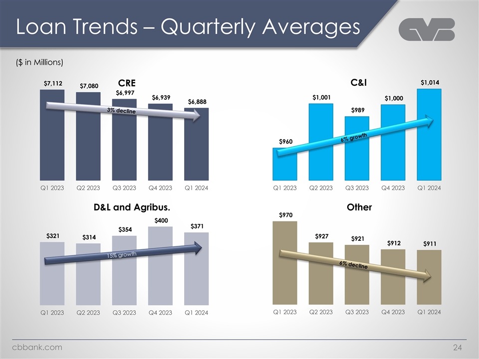 Loan Composition Q1 2023 Q1 2024 CRE OO CRE OO 28% 28% C&I C&I 11% Total CRE Total CRE 10% 78% 77% D&L and Agribus. D&L and Agribus. 3% 4% Other Other 9% 8% CRE NOO CRE NOO 50% 49% cbbank.com 23
