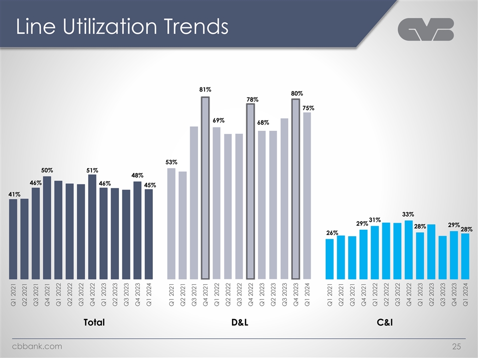 Loan Trends – Quarterly Averages ($ in Millions) $1,014 $7,112 C&I CRE $7,080 $6,997 $6,939 $1,001 $1,000 $6,888 $989 $960 Q1 2023 Q2 2023 Q3 2023 Q4 2023 Q1 2024 Q1 2023 Q2 2023 Q3 2023 Q4 2023 Q1 2024 D&L and Agribus. Other $970 $400 $371 $354 $321 $927 $314 $921 $912 $911 Q1 2023 Q2 2023 Q3 2023 Q4 2023 Q1 2024 Q1 2023 Q2 2023 Q3 2023 Q4 2023 Q1 2024 cbbank.com 24