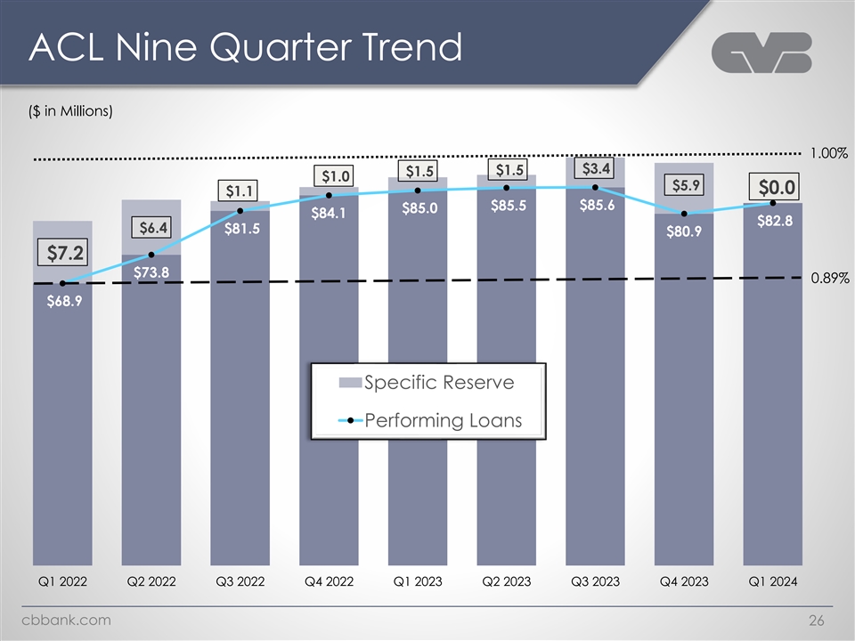 Line Utilization Trends 81% 80% 78% 75% 69% 68% 53% 50% 51% 48% 46% 46% 45% 41% 33% 31% 29% 29% 28% 28% 26% Total D&L C&I cbbank.com 25 Q1 2021 Q2 2021 Q3 2021 Q4 2021 Q1 2022 Q2 2022 Q3 2022 Q4 2022 Q1 2023 Q2 2023 Q3 2023 Q4 2023 Q1 2024 Q1 2021 Q2 2021 Q3 2021 Q4 2021 Q1 2022 Q2 2022 Q3 2022 Q4 2022 Q1 2023 Q2 2023 Q3 2023 Q4 2023 Q1 2024 Q1 2021 Q2 2021 Q3 2021 Q4 2021 Q1 2022 Q2 2022 Q3 2022 Q4 2022 Q1 2023 Q2 2023 Q3 2023 Q4 2023 Q1 2024