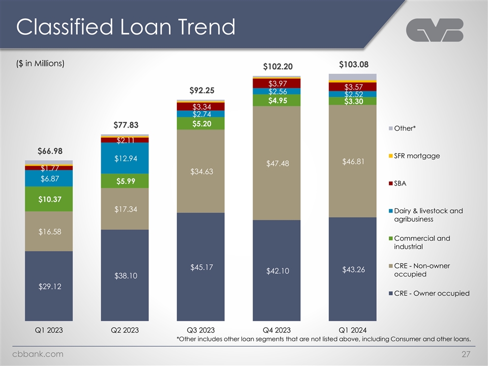 ACL Nine Quarter Trend ($ in Millions) 1.00% $3.4 $1.5 $1.5 $1.0 $5.9 $0.0 $1.1 $85.5 $85.6 $85.0 $84.1 $82.8 $6.4 $81.5 $80.9 $7.2 $73.8 0.89% $68.9 Specific Reserve Performing Loans Q1 2022 Q2 2022 Q3 2022 Q4 2022 Q1 2023 Q2 2023 Q3 2023 Q4 2023 Q1 2024 cbbank.com 26