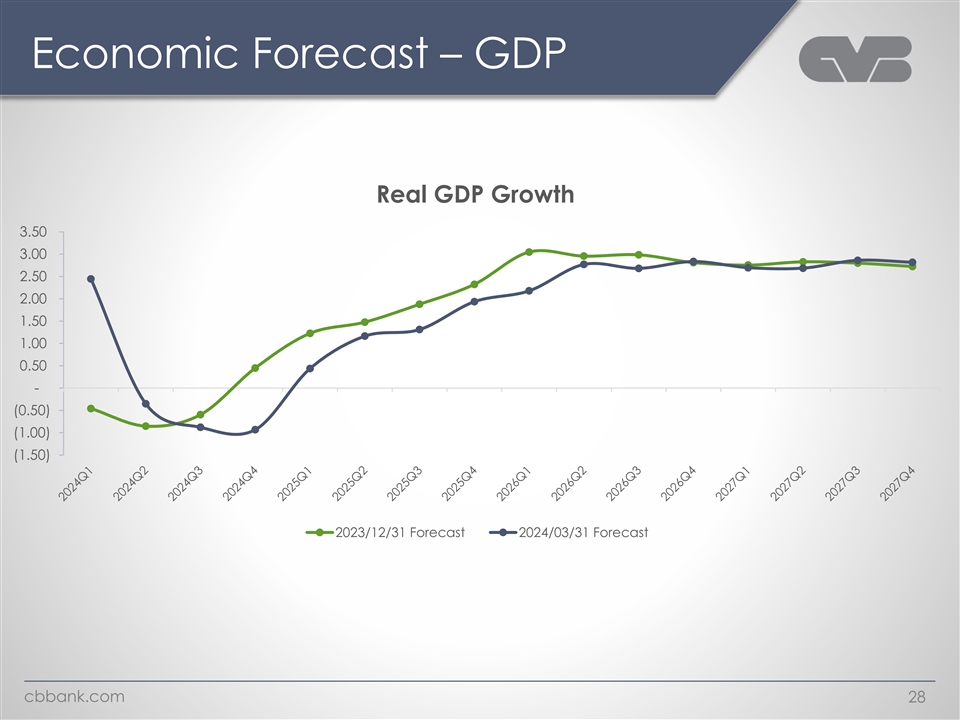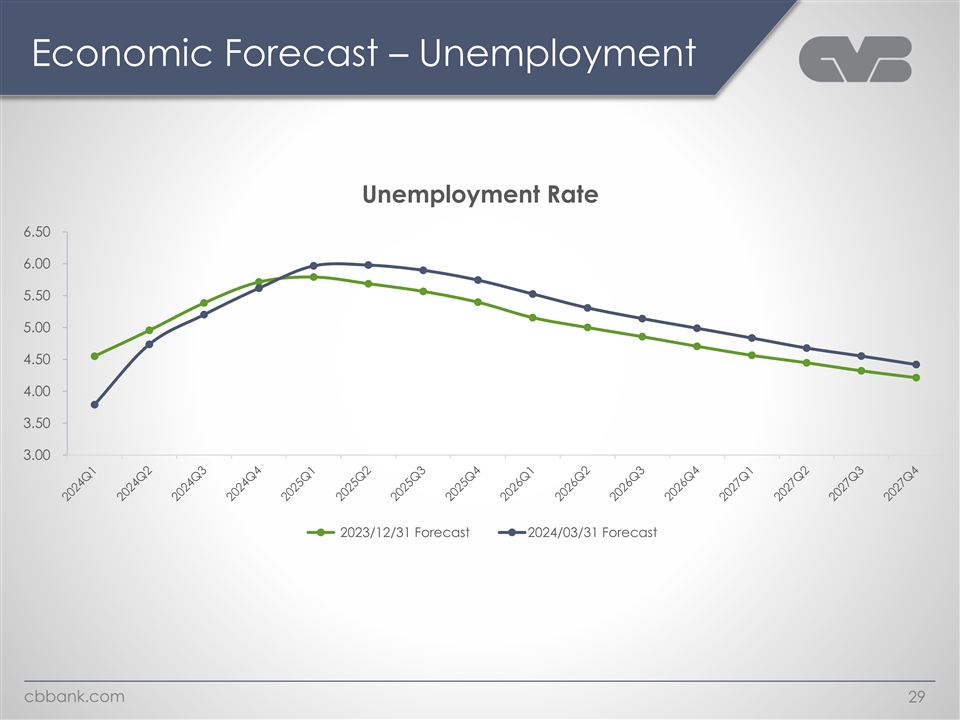Economic Forecast – GDP Real GDP Growth 3.50 3.00 2.50 2.00 1.50 1.00 0.50 - (0.50) (1.00) (1.50) 2023/12/31 Forecast 2024/03/31 Forecast cbbank.com 28