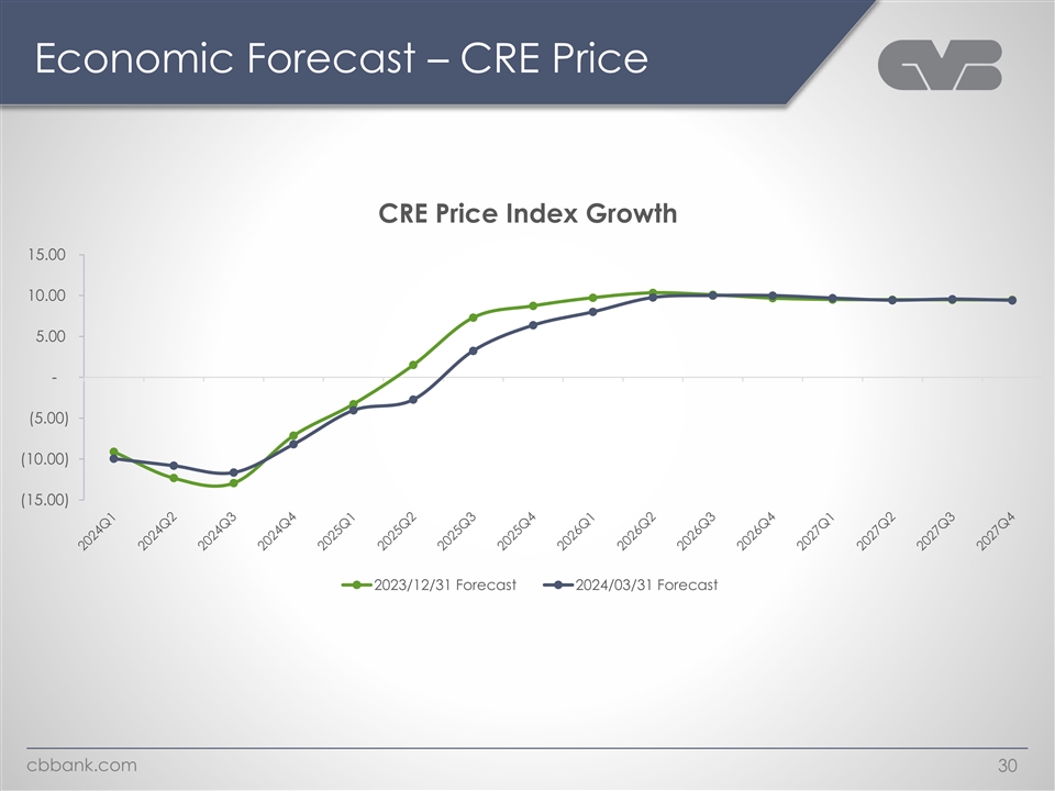 Economic Forecast – Unemployment Unemployment Rate 6.50 6.00 5.50 5.00 4.50 4.00 3.50 3.00 2023/12/31 Forecast 2024/03/31 Forecast cbbank.com 29
