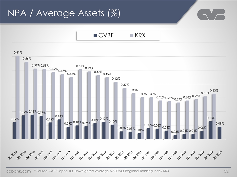Net Charge-Offs / Average Loans (%) CVBF KRX 0.08% 0.06% 0.06% 0.06% 0.05% 0.05% 0.05% 0.05% 0.05% 0.04% 0.04% 0.04% 0.04% 0.04% 0.04% 0.03% 0.03% 0.03% 0.03% 0.03% 0.02% 0.02% 0.02% 0.01% 0.01% 0.01% 0.00% 0.00% 0.00% 0.00% 0.00% 0.00% 0.00% 0.00% 0.00% 0.00% 0.00% 0.00% 0.00% 0.00% 0.00% 0.00% 0.00% 0.00% -0.01% -0.01% -0.01% * Source: S&P Capital IQ. Unweighted Average NASDAQ Regional Banking Index KRX cbbank.com 31
