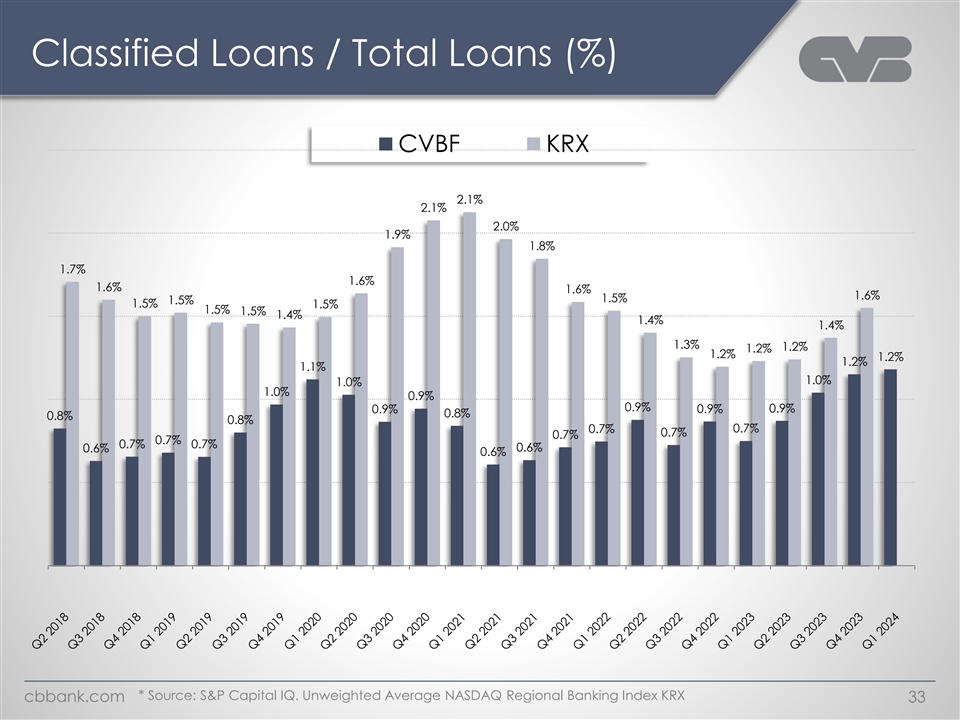 NPA / Average Assets (%) CVBF KRX 0.61% 0.56% 0.51% 0.51% 0.51% 0.49% 0.49% 0.47% 0.47% 0.45% 0.45% 0.42% 0.37% 0.33% 0.33% 0.31% 0.30% 0.30% 0.29% 0.28% 0.28% 0.28% 0.27% 0.18% 0.17% 0.17% 0.14% 0.13% 0.13% 0.12% 0.12% 0.12% 0.10% 0.10% 0.09% 0.09% 0.09% 0.08% 0.08% 0.06% 0.06% 0.06% 0.05% 0.04% 0.04% 0.04% 0.03% * Source: S&P Capital IQ. Unweighted Average NASDAQ Regional Banking Index KRX cbbank.com 32