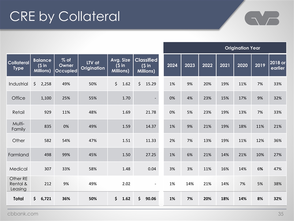 Commercial Real Estate Loans Collateral Type Owner/Non-Owner Occupied Other RE Rental Non- Medical and Leasing Farmland Owner 5% 3% 7% 64% Industrial Other 34% 9% Multi- Family 12% Owner Retail Office 36% 14% 16% cbbank.com 34