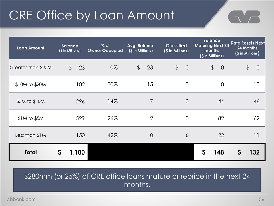 CRE Office by Loan Amount Balance Rate Resets Next % of Maturing Next 24 Avg. Balance Classified Balance Loan Amount 24 Months ($ in Millions) ($ in Millions) Owner Occupied ($ in Millions) months ($ in Millions) ($ in Millions) Greater than $20M $ 23 0% $ 23 $ 0 $ 0 $ 0 $10M to $20M 102 30% 15 0 0 13 $5M to $10M 296 14% 7 0 44 46 $1M to $5M 529 26% 2 0 82 62 Less than $1M 0 150 42% 0 22 11 Total $ 1,100 $ 148 $ 132 $280mm (or 25%) of CRE office loans mature or reprice in the next 24 months. cbbank.com 36