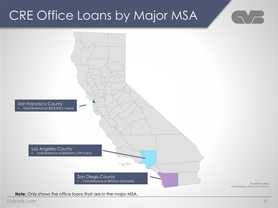 CRE Office Loans by Major MSA San Francisco County • Total Balance of $323,000 (1 loan) Los Angeles County • Total Balance of $402mm (199 loans) San Diego County • Total Balance of $90mm (24 loans) Note: Only shows the office loans that are in the major MSA. cbbank.com 37
