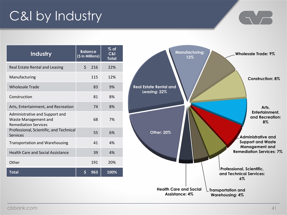 Greater SF Business Density Distribution % of Area $ Loan LTV at Owner Avg. Size Classified ($ in thousands) Balance Origination Occupied Downtown SF (HBD) $ 323 0% 3% $ 323 $ 0 0 0% 0% 0 0 Other SF • Darker shaded areas represent Higher Business Density (HBD) Total $ 323 0% 3% $ 323 $ 0 cbbank.com 40