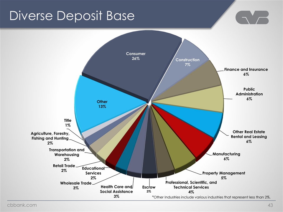 Diverse Deposit Base Consumer 26% Construction 7% Finance and Insurance 6% Public Administration 6% Other 13% Title 1% Other Real Estate Agriculture, Forestry, Rental and Leasing Fishing and Hunting 6% 2% Transportation and Manufacturing Warehousing 6% 2% Retail Trade Educational 2% Services Property Management 2% 5% Professional, Scientific, and Wholesale Trade Health Care and Escrow Technical Services 3% 3% Social Assistance 4% 3% *Other Industries include various industries that represent less than 2%. cbbank.com 43