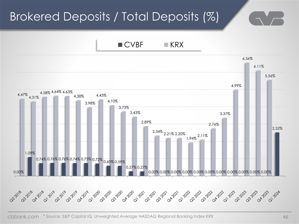 Brokered Deposits / Total Deposits (%) CVBF KRX 6.56% 6.11% 5.56% 4.99% 4.64% 4.63% 4.58% 4.47% 4.43% 4.38% 4.31% 4.10% 3.98% 3.73% 3.43% 3.37% 2.89% 2.76% 2.52% 2.34% 2.21% 2.20% 2.11% 1.94% 1.09% 0.76% 0.76% 0.74% 0.74% 0.75% 0.72% 0.60% 0.59% 0.27% 0.27% 0.00% 0.00% 0.00% 0.00% 0.00% 0.00% 0.00% 0.00% 0.00% 0.00% 0.00% 0.00% * Source: S&P Capital IQ. Unweighted Average NASDAQ Regional Banking Index KRX cbbank.com 46