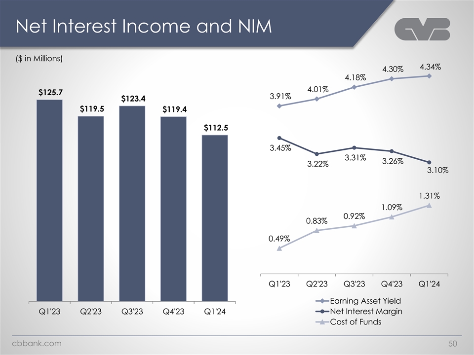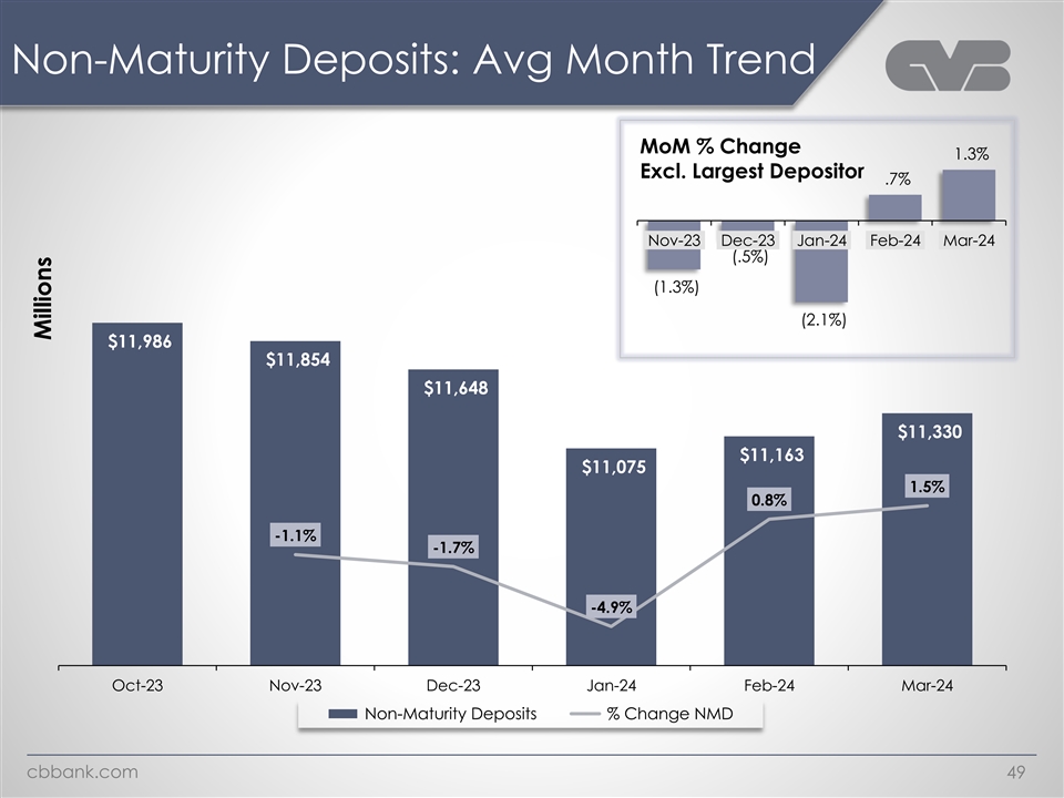 Non-Maturity Deposits: Avg Month Trend MoM % Change 1.3% Excl. Largest Depositor .7% Nov-23 Dec-23 Jan-24 Feb-24 Mar-24 (.5%) (1.3%) (2.1%) $11,986 $11,854 $11,648 $11,330 $11,163 $11,075 1.5% 0.8% -1.1% -1.7% -4.9% Oct-23 Nov-23 Dec-23 Jan-24 Feb-24 Mar-24 Non-Maturity Deposits % Change NMD cbbank.com 49 Millions