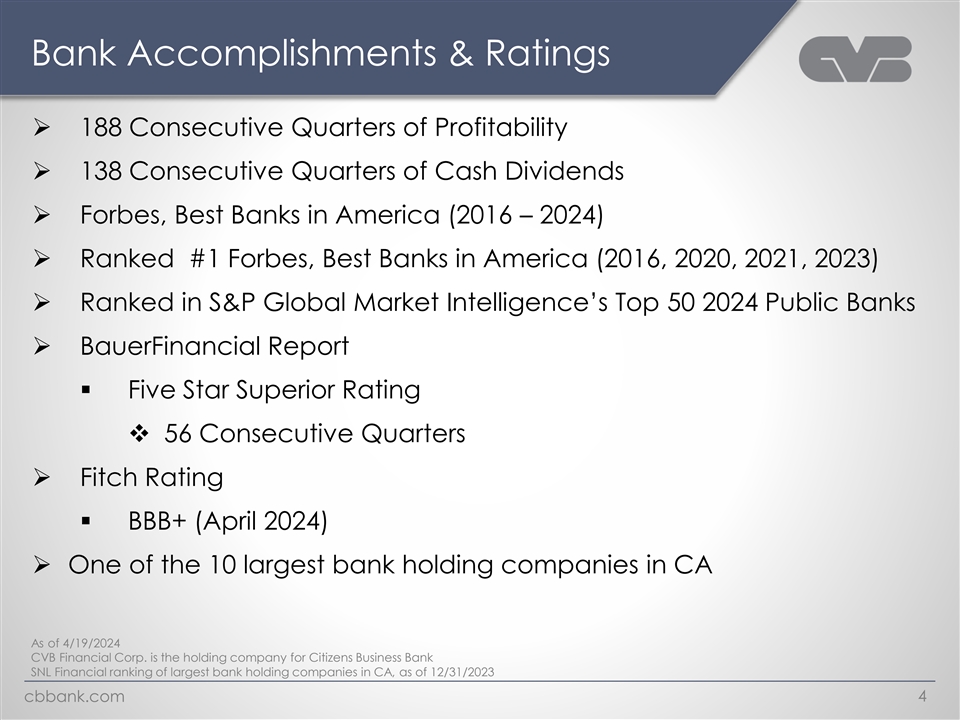 CVB Financial Corp. (CVBF) ▪ Total Assets: $16.5 Billion ▪ Gross Loans: $ 8.8 Billion ▪ Total Deposits (Including Repos): $12.2 Billion ▪ Total Equity: $ 2.1 Billion ➢ Largest financial institution headquartered in the Inland Empire region of Southern California. Founded in 1974. 3 cbbank.com