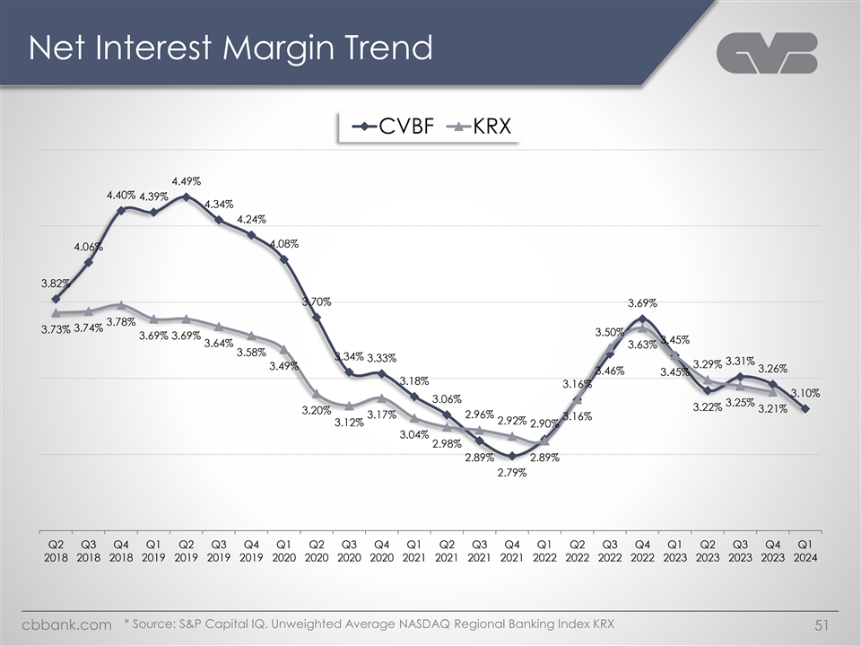 Net Interest Margin Trend CVBF KRX 4.49% 4.40% 4.39% 4.34% 4.24% 4.08% 4.06% 3.82% 3.70% 3.69% 3.78% 3.74% 3.73% 3.50% 3.69% 3.69% 3.45% 3.64% 3.63% 3.58% 3.34% 3.33% 3.31% 3.29% 3.49% 3.26% 3.46% 3.45% 3.18% 3.16% 3.10% 3.06% 3.25% 3.22% 3.21% 3.20% 3.17% 2.96% 3.16% 2.92% 3.12% 2.90% 3.04% 2.98% 2.89% 2.89% 2.79% Q2 Q3 Q4 Q1 Q2 Q3 Q4 Q1 Q2 Q3 Q4 Q1 Q2 Q3 Q4 Q1 Q2 Q3 Q4 Q1 Q2 Q3 Q4 Q1 2018 2018 2018 2019 2019 2019 2019 2020 2020 2020 2020 2021 2021 2021 2021 2022 2022 2022 2022 2023 2023 2023 2023 2024 * Source: S&P Capital IQ. Unweighted Average NASDAQ Regional Banking Index KRX cbbank.com 51