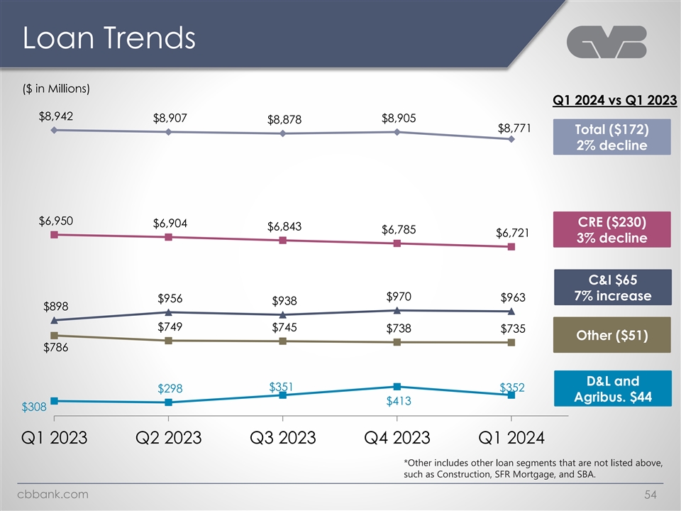 Loans by Type C&I CRE Owner $0.96B 27.5% Commercial and industrial 11.0% Dairy & livestock and agribusiness 4.0% CRE $6.72B SFR mortgage 3.2% SBA 3.1% Municipal lease finance receivable 0.8% CRE Non-Owner 49.1% Construction 0.7% Consumer and other Other loans $1.09B 0.6% cbbank.com 53