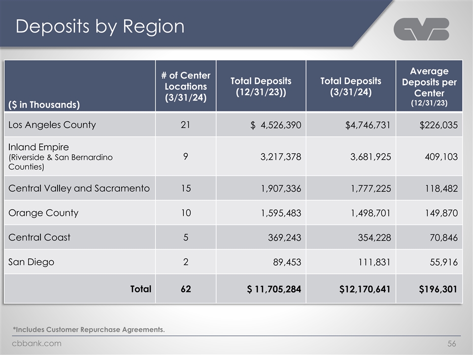 Deposits by Region Average # of Center Total Deposits Total Deposits Deposits per Locations (12/31/23)) (3/31/24) Center (3/31/24) (12/31/23) ($ in Thousands) Los Angeles County 21 $ 4,526,390 $4,746,731 $226,035 Inland Empire 9 (Riverside & San Bernardino 3,217,378 3,681,925 409,103 Counties) Central Valley and Sacramento 15 1,907,336 1,777,225 118,482 Orange County 10 1,595,483 1,498,701 149,870 Central Coast 5 369,243 354,228 70,846 San Diego 2 89,453 111,831 55,916 Total 62 $ 11,705,284 $12,170,641 $196,301 *Includes Customer Repurchase Agreements. cbbank.com 56