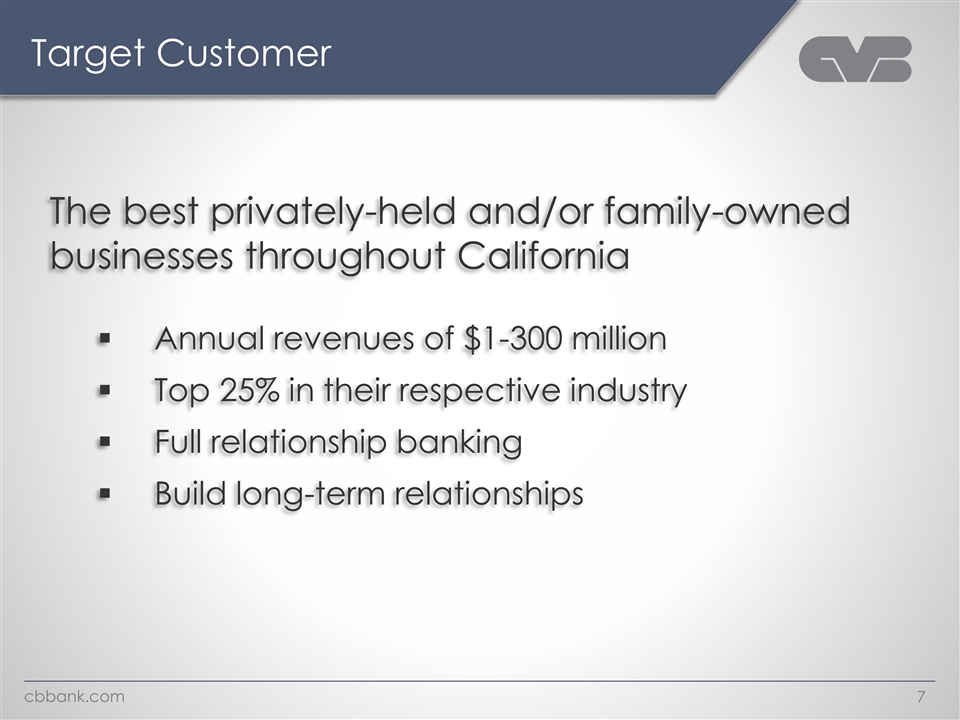 Our Vision Citizens Business Bank will strive to become the premier financial services company operating throughout the state of California, servicing the comprehensive financial needs of successful small to medium sized businesses and their owners. cbbank.com 6