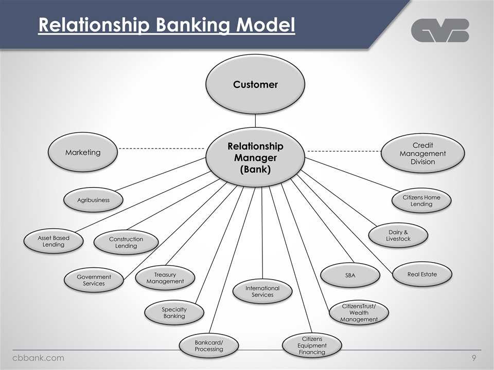 Relationship Banking Model Customer Credit Relationship Marketing Management Manager Division (Bank) Citizens Home Agribusiness Lending Dairy & Asset Based Construction Livestock Lending Lending Real Estate Treasury SBA Government Management Services International Services CitizensTrust/ Specialty Wealth Banking Management Citizens Bankcard/ Equipment Processing Financing cbbank.com 9