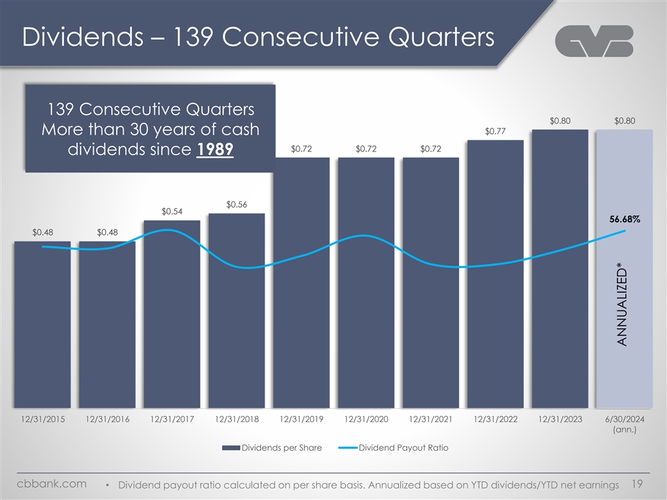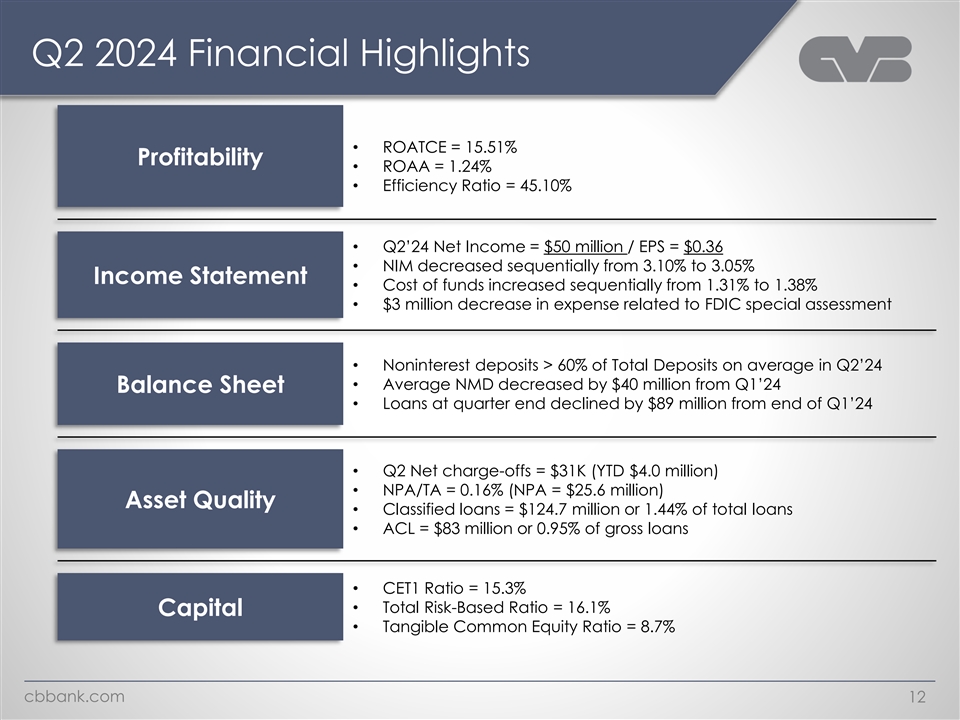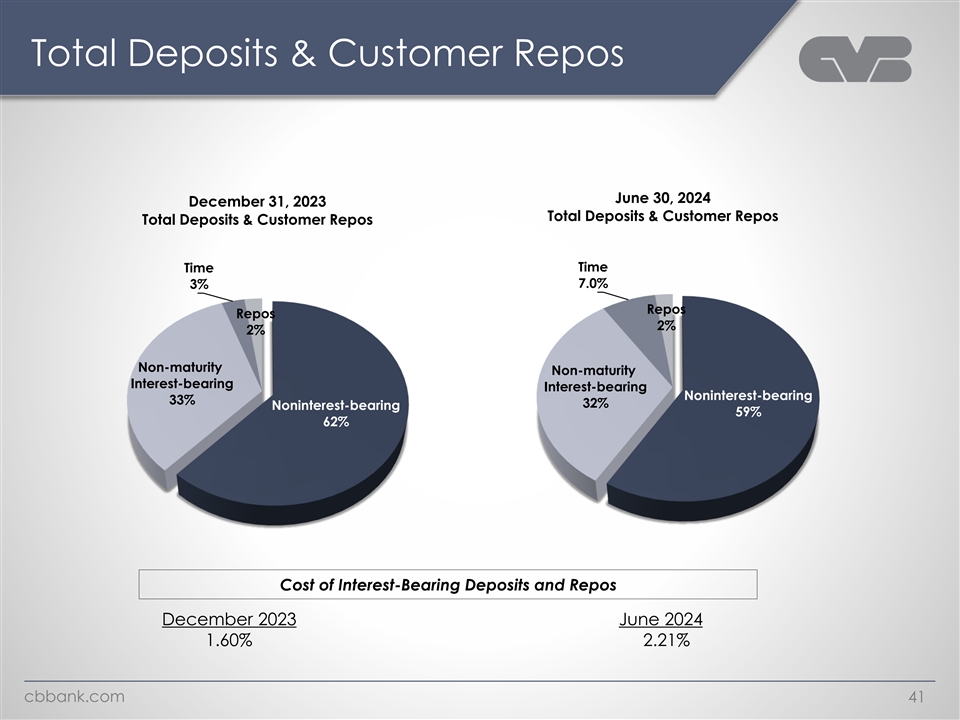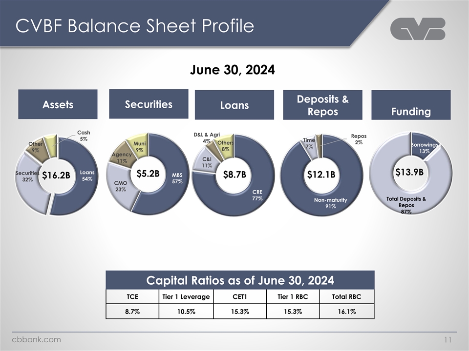 CVBF Balance Sheet Profile June 30, 2024 Deposits & Securities Assets Loans Repos Funding Cash D&L & Agri Repos 5% Time 4% 2% Others Muni Other Borrowings 7% 8% 9% 9% 13% Agency C&I 11% 11% Loans Securities $13.9B $5.2B MBS $8.7B $12.1B $16.2B 54% 32% 57% CMO 23% CRE 77% Total Deposits & Non-maturity Repos 91% 87% Capital Ratios as of June 30, 2024 TCE Tier 1 Leverage CET1 Tier 1 RBC Total RBC 8.7% 10.5% 15.3% 15.3% 16.1% cbbank.com 11