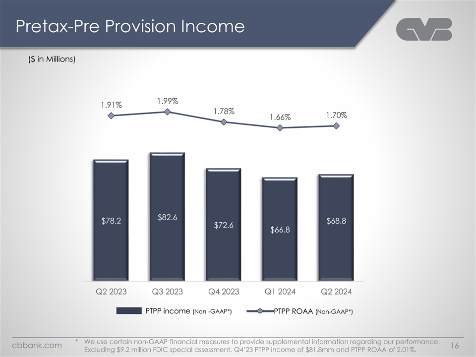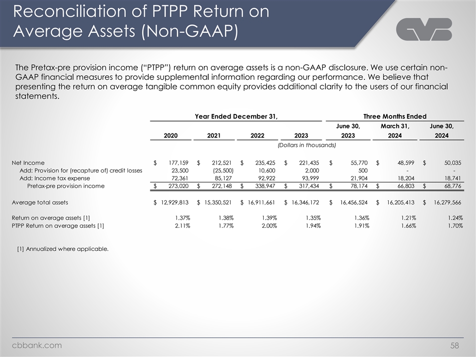 Reconciliation of PTPP Return on Average Assets (Non-GAAP) The Pretax-pre provision income (“PTPP”) return on average assets is a non-GAAP disclosure. We use certain non- GAAP financial measures to provide supplemental information regarding our performance. We believe that presenting the return on average tangible common equity provides additional clarity to the users of our financial statements. Year Ended December 31, Three Months Ended June 30, March 31, June 30, 2020 2021 2022 2023 2023 2024 2024 (Dollars in thousands) Net Income $ 1 77,159 $ 212,521 $ 235,425 $ 221,435 $ 55,770 $ 48,599 $ 50,035 Add: Provision for (recapture of) credit losses 23,500 (25,500) 10,600 2,000 500 - - Add: Income tax expense 72,361 85,127 92,922 93,999 21,904 18,204 18,741 Pretax-pre provision income $ 2 73,020 $ 2 72,148 $ 3 38,947 $ 317,434 $ 78,174 $ 66,803 $ 68,776 Average total assets $ 12,929,813 $ 15,350,521 $ 16,911,661 $ 16,346,172 $ 16,456,524 $ 16,205,413 $ 16,279,566 Return on average assets [1] 1.37% 1.38% 1.39% 1.35% 1.36% 1.21% 1.24% PTPP Return on average assets [1] 2.11% 1.77% 2.00% 1.94% 1.91% 1.66% 1.70% [1] Annualized where applicable. cbbank.com 58