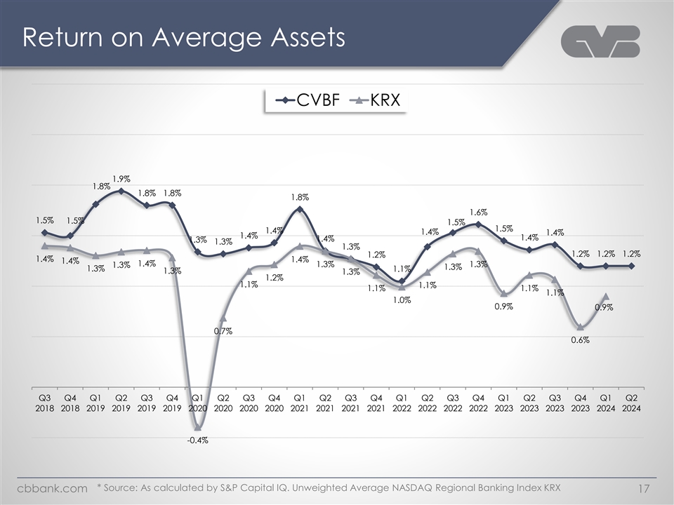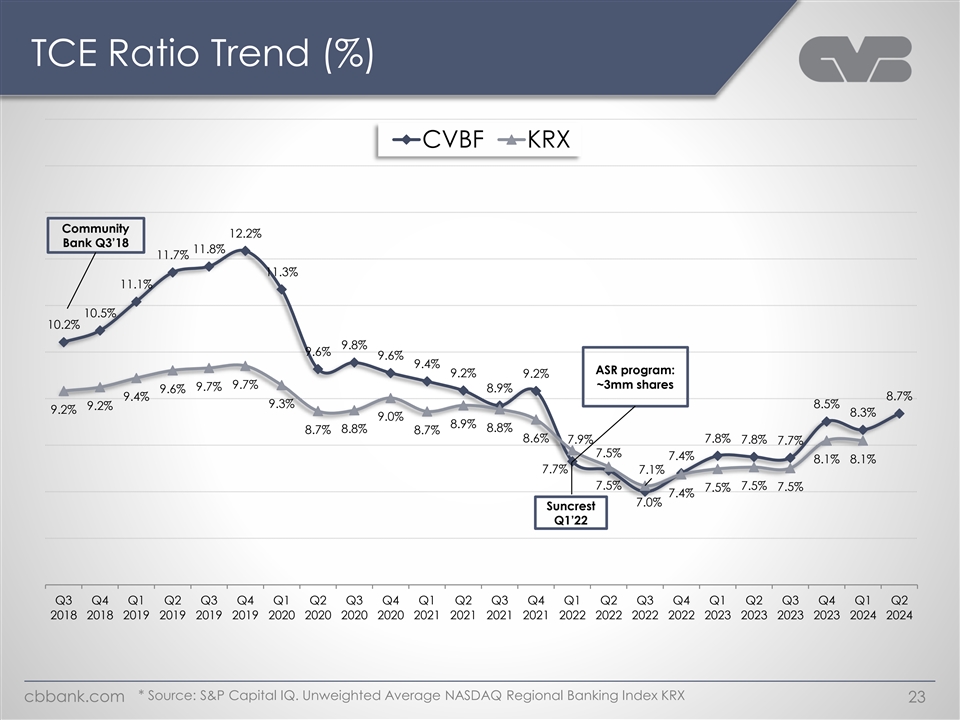 Return on Average Tangible Common Equity CVBF KRX 23.7% 21.4% 20.2% 19.5% 18.9% 18.8% 18.5% 18.5% 18.3% 19.8% 16.7% 16.5% 16.3% 18.3% 16.1% 16.0% 15.8% 15.4% 15.3% 15.0% 15.1% 14.7% 16.4% 16.1% 14.0% 15.5% 13.7% 15.7% 15.5% 15.1% 14.9% 14.7% 14.7% 14.7% 14.6% 12.5% 14.5% 12.2% 14.2% 14.1% 13.9% 13.4% 12.3% 12.1% 9.7% 8.1% 5.0% Q3 Q4 Q1 Q2 Q3 Q4 Q1 Q2 Q3 Q4 Q1 Q2 Q3 Q4 Q1 Q2 Q3 Q4 Q1 Q2 Q3 Q4 Q1 Q2 2018 2018 2019 2019 2019 2019 2020 2020 2020 2020 2021 2021 2021 2021 2022 2022 2022 2022 2023 2023 2023 2023 2024 2024 * Source: As calculated by S&P Capital IQ. Unweighted Average NASDAQ Regional Banking Index KRX cbbank.com 18
