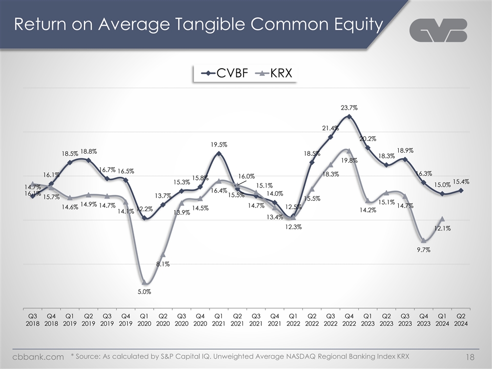 Return on Average Assets CVBF KRX 1.9% 1.8% 1.8% 1.8% 1.8% 1.6% 1.5% 1.5% 1.5% 1.5% 1.4% 1.4% 1.4% 1.4% 1.4% 1.4% 1.3% 1.3% 1.3% 1.2% 1.2% 1.2% 1.2% 1.4% 1.4% 1.4% 1.4% 1.3% 1.3% 1.3% 1.3% 1.3% 1.1% 1.3% 1.3% 1.2% 1.1% 1.1% 1.1% 1.1% 1.1% 1.0% 0.9% 0.9% 0.7% 0.6% Q3 Q4 Q1 Q2 Q3 Q4 Q1 Q2 Q3 Q4 Q1 Q2 Q3 Q4 Q1 Q2 Q3 Q4 Q1 Q2 Q3 Q4 Q1 Q2 2018 2018 2019 2019 2019 2019 2020 2020 2020 2020 2021 2021 2021 2021 2022 2022 2022 2022 2023 2023 2023 2023 2024 2024 -0.4% * Source: As calculated by S&P Capital IQ. Unweighted Average NASDAQ Regional Banking Index KRX cbbank.com 17