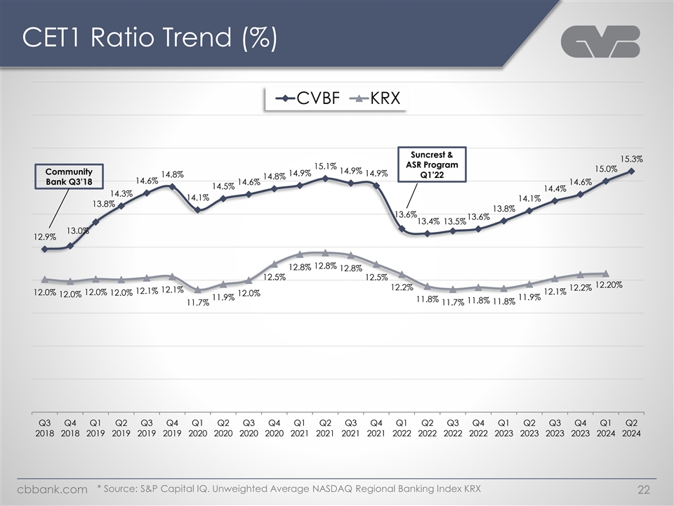 Strong Capital Ratios CVBF CET1 % KRX Avg CET1 % Regulatory Min. 15.3% 15.0% 14.6% 14.4% 14.1% 13.8% 13.5% 13.6% 13.4% 12.2% 12.2% 11.8% 12.1% 11.8% 11.9% 11.7% 11.8% 7.0% 7.0% 7.0% 7.0% 7.0% 7.0% 7.0% 7.0% 7.0% Q2 2022 Q3 2022 Q4 2022 Q1 2023 Q2 2023 Q3 2023 Q4 2023 Q1 2024 Q2 2024 Capital Ratios 16.1% 15.3% 15.3% As of Q2 2024 5.6% 10.5% 6.8% $614mm 8.3% $907mm $743mm 6.5% $1B 10.5% 8.5% 7.0% 4.0% T1 Leverage CET1 T1 RBC Total RBC Regulatory Minimum + Capital Conservation Buffer Excess Capital * Source: S&P Capital IQ. Unweighted Average NASDAQ Regional Banking Index KRX (50 Banks) cbbank.com 21