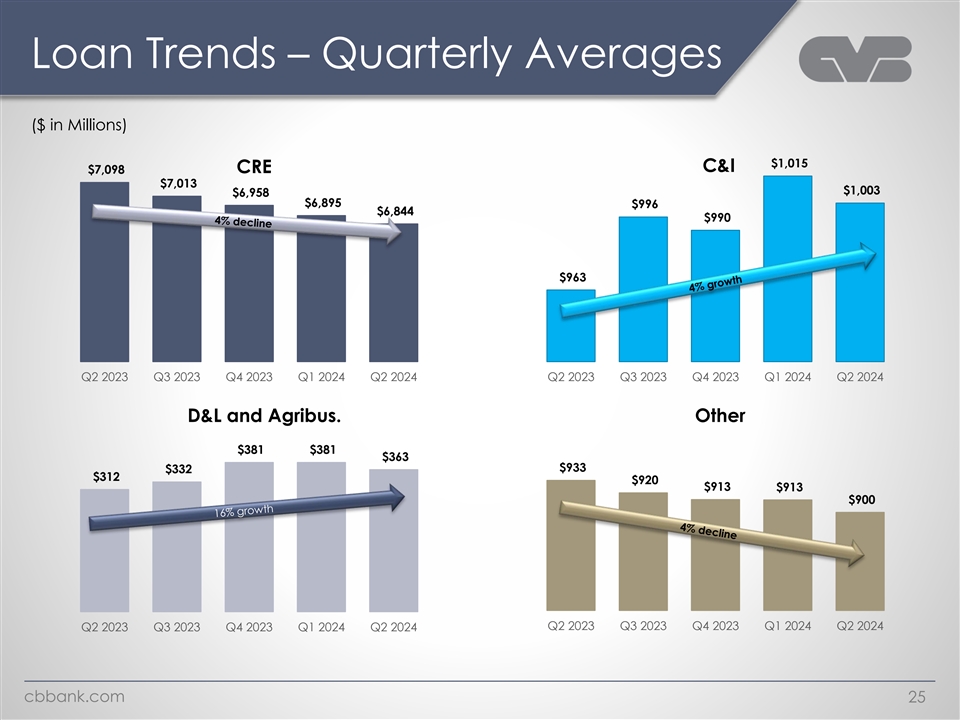 Loan Composition Q2 2023 Q2 2024 CRE OO CRE OO 28% 28% C&I C&I Total CRE Total CRE 11% 11% 78% 77% D&L and Agribus. D&L and Agribus. 4% 3% Other Other 8% 8% CRE NOO CRE NOO 50% 49% cbbank.com 24