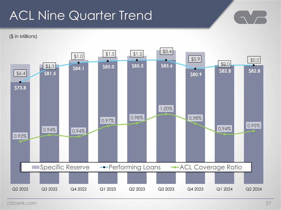 Line Utilization Trends 81% 80% 78% 74% 68% 66% 52% 51% 50% 48% 47% 45% 45% 41% 33% 32% 31% 29% 29% 29% 27% Total D&L C&I cbbank.com 26 Q1 2021 Q2 2021 Q3 2021 Q4 2021 Q1 2022 Q2 2022 Q3 2022 Q4 2022 Q1 2023 Q2 2023 Q3 2023 Q4 2023 Q1 2024 Q2 2024 Q1 2021 Q2 2021 Q3 2021 Q4 2021 Q1 2022 Q2 2022 Q3 2022 Q4 2022 Q1 2023 Q2 2023 Q3 2023 Q4 2023 Q1 2024 Q2 2024 Q1 2021 Q2 2021 Q3 2021 Q4 2021 Q1 2022 Q2 2022 Q3 2022 Q4 2022 Q1 2023 Q2 2023 Q3 2023 Q4 2023 Q1 2024 Q2 2024