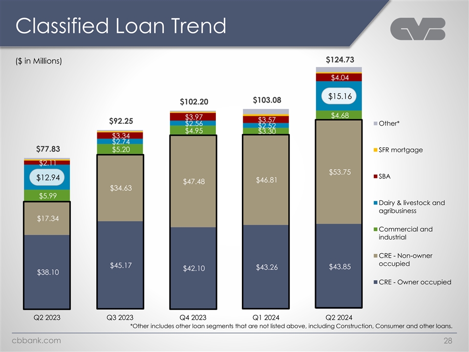 Classified Loan Trend $124.73 ($ in Millions) $4.04 $15.16 $103.08 $102.20 $4.68 $3.97 $3.57 $92.25 $2.56 Other* $2.52 $4.95 $3.30 $3.34 $2.74 $77.83 $5.20 SFR mortgage $2.11 $53.75 SBA $12.94 $46.81 $47.48 $34.63 $5.99 Dairy & livestock and agribusiness $17.34 Commercial and industrial CRE - Non-owner occupied $45.17 $43.85 $43.26 $42.10 $38.10 CRE - Owner occupied Q2 2023 Q3 2023 Q4 2023 Q1 2024 Q2 2024 *Other includes other loan segments that are not listed above, including Construction, Consumer and other loans. cbbank.com 28