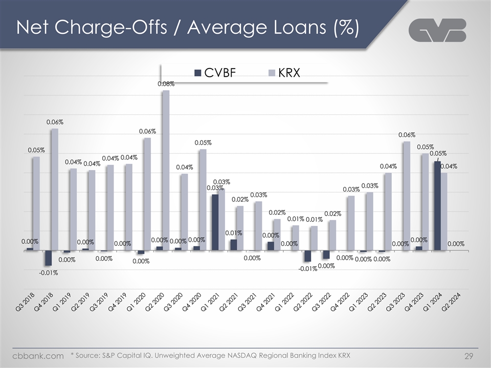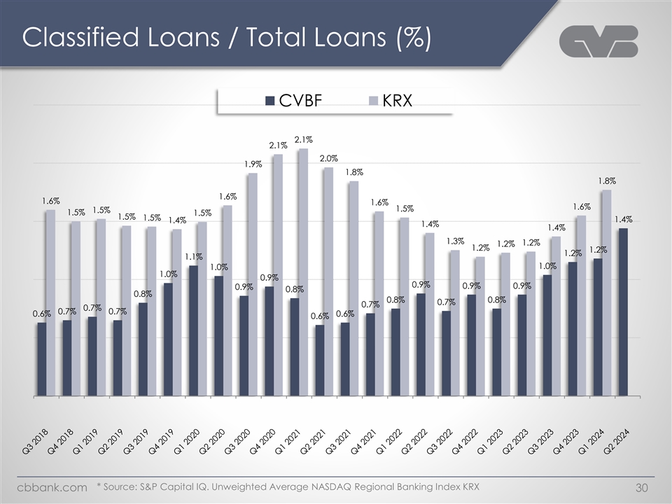 Net Charge-Offs / Average Loans (%) CVBF KRX 0.08% 0.06% 0.06% 0.06% 0.05% 0.05% 0.05% 0.05% 0.04% 0.04% 0.04% 0.04% 0.04% 0.04% 0.04% 0.03% 0.03% 0.03% 0.03% 0.03% 0.02% 0.02% 0.02% 0.01% 0.01% 0.01% 0.00% 0.00% 0.00% 0.00% 0.00% 0.00% 0.00% 0.00% 0.00% 0.00% 0.00% 0.00% 0.00% 0.00% 0.00% 0.00% 0.00% 0.00% 0.00% -0.01% -0.01% * Source: S&P Capital IQ. Unweighted Average NASDAQ Regional Banking Index KRX cbbank.com 29