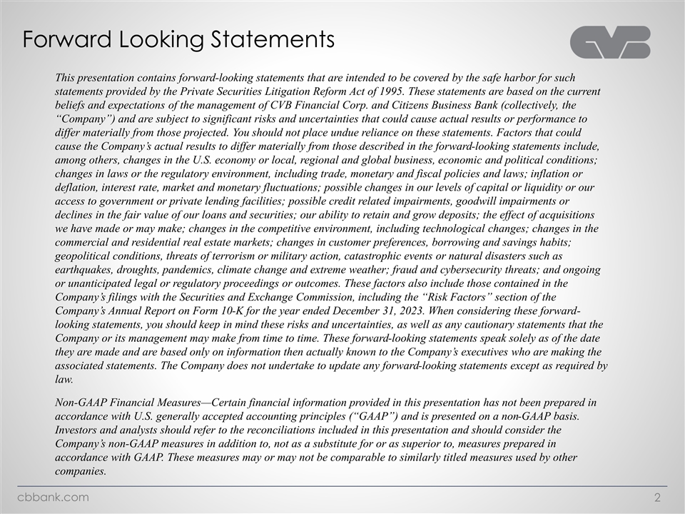 Forward Looking Statements This presentation contains forward-looking statements that are intended to be covered by the safe harbor for such statements provided by the Private Securities Litigation Reform Act of 1995. These statements are based on the current beliefs and expectations of the management of CVB Financial Corp. and Citizens Business Bank (collectively, the “Company”) and are subject to significant risks and uncertainties that could cause actual results or performance to differ materially from those projected. You should not place undue reliance on these statements. Factors that could cause the Company’s actual results to differ materially from those described in the forward-looking statements include, among others, changes in the U.S. economy or local, regional and global business, economic and political conditions; changes in laws or the regulatory environment, including trade, monetary and fiscal policies and laws; inflation or deflation, interest rate, market and monetary fluctuations; possible changes in our levels of capital or liquidity or our access to government or private lending facilities; possible credit related impairments, goodwill impairments or declines in the fair value of our loans and securities; our ability to retain and grow deposits; the effect of acquisitions we have made or may make; changes in the competitive environment, including technological changes; changes in the commercial and residential real estate markets; changes in customer preferences, borrowing and savings habits; geopolitical conditions, threats of terrorism or military action, catastrophic events or natural disasters such as earthquakes, droughts, pandemics, climate change and extreme weather; fraud and cybersecurity threats; and ongoing or unanticipated legal or regulatory proceedings or outcomes. These factors also include those contained in the Company’s filings with the Securities and Exchange Commission, including the “Risk Factors” section of the Company’s Annual Report on Form 10-K for the year ended December 31, 2023. When considering these forward- looking statements, you should keep in mind these risks and uncertainties, as well as any cautionary statements that the Company or its management may make from time to time. These forward-looking statements speak solely as of the date they are made and are based only on information then actually known to the Company’s executives who are making the associated statements. The Company does not undertake to update any forward-looking statements except as required by law. Non-GAAP Financial Measures—Certain financial information provided in this presentation has not been prepared in accordance with U.S. generally accepted accounting principles (“GAAP”) and is presented on a non-GAAP basis. Investors and analysts should refer to the reconciliations included in this presentation and should consider the Company’s non-GAAP measures in addition to, not as a substitute for or as superior to, measures prepared in accordance with GAAP. These measures may or may not be comparable to similarly titled measures used by other companies. cbbank.com 2
