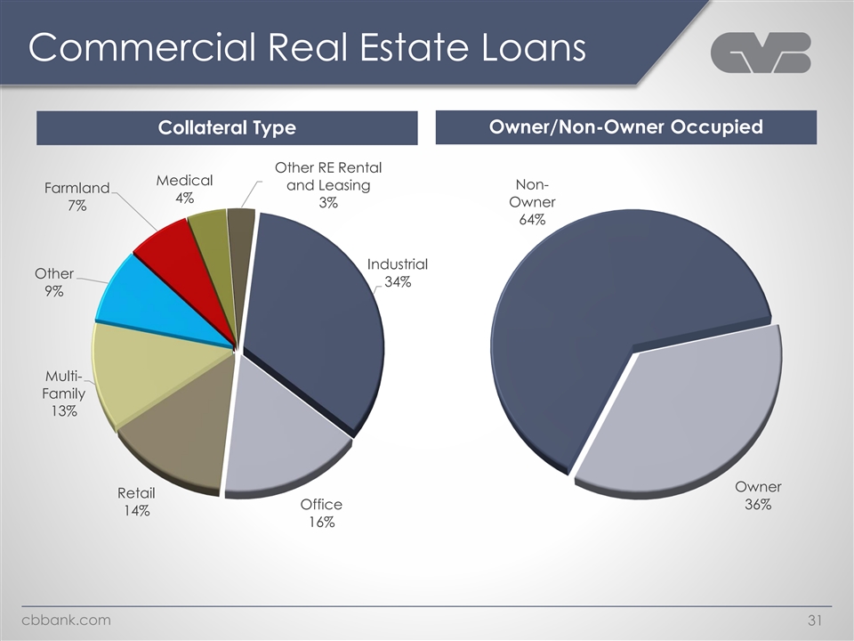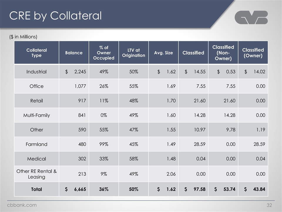 Commercial Real Estate Loans Collateral Type Owner/Non-Owner Occupied Other RE Rental Medical and Leasing Non- Farmland 4% 3% Owner 7% 64% Industrial Other 34% 9% Multi- Family 13% Owner Retail Office 36% 14% 16% cbbank.com 31