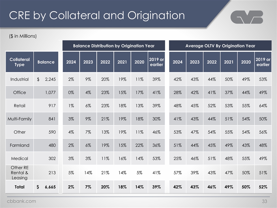 CRE by Collateral ($ in Millions) Classified % of Collateral LTV at Classified Balance Owner Avg. Size Classified (Non- Type Origination (Owner) Occupied Owner) Industrial $ 2,245 49% 50% $ 1.62 $ 14.55 $ 0.53 $ 14.02 Office 1,077 26% 55% 1.69 7.55 7.55 0.00 Retail 917 11% 48% 1.70 21.60 21.60 0.00 Multi-Family 841 0% 49% 1.60 14.28 14.28 0.00 Other 590 55% 47% 1.55 10.97 9.78 1.19 Farmland 480 99% 45% 1.49 28.59 0.00 2 8 .5 9 Medical 302 33% 58% 1.48 0.04 0.00 0.04 Other RE Rental & 213 9% 49% 2.06 0.00 0.00 0.00 Leasing $ 6,665 36% 50% $ 1.62 $ 97.58 $ 53.74 $ 43.84 Total cbbank.com 32