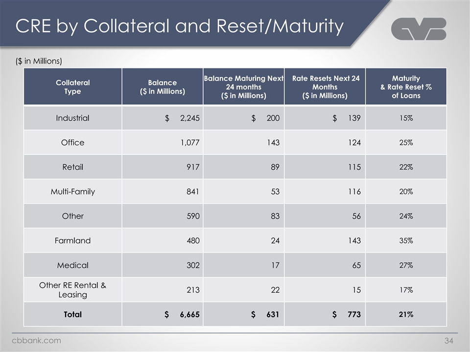 CRE by Collateral and Origination ($ in Millions) Balance Distribution by Origination Year Average OLTV By Origination Year Collateral 2019 or 2019 or Balance 2024 2023 2022 2021 2020 2024 2023 2022 2021 2020 Type earlier earlier Industrial $ 2,245 2% 9% 20% 19% 11% 39% 42% 43% 44% 50% 49% 53% Office 1,077 0% 4% 23% 15% 17% 41% 28% 42% 41% 37% 44% 49% Retail 917 1% 6% 23% 18% 13% 39% 48% 45% 52% 53% 55% 64% Multi-Family 841 3% 9% 21% 19% 18% 30% 41% 43% 44% 51% 54% 50% Other 590 4% 7% 13% 19% 11% 46% 53% 47% 54% 55% 54% 56% Farmland 480 2% 6% 19% 15% 22% 36% 51% 44% 45% 49% 43% 48% Medical 302 3% 3% 11% 16% 14% 53% 25% 46% 51% 48% 55% 49% Other RE Rental & 213 5% 14% 21% 14% 5% 41% 57% 39% 43% 47% 50% 51% Leasing Total $ 6,665 2% 7% 20% 18% 14% 39% 42% 43% 46% 49% 50% 52% cbbank.com 33