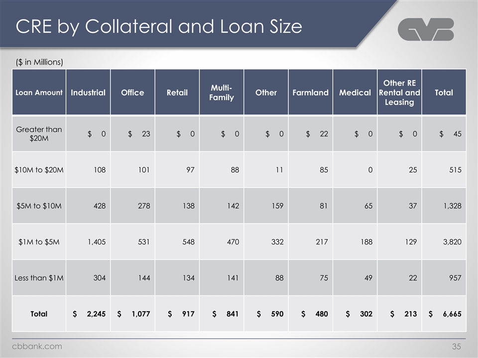 CRE by Collateral and Reset/Maturity ($ in Millions) Balance Maturing Next Rate Resets Next 24 Maturity Collateral Balance 24 months Months & Rate Reset % Type ($ in Millions) ($ in Millions) ($ in Millions) of Loans Industrial $ 2,245 $ 200 $ 139 15% Office 1,077 143 124 25% 22% Retail 917 89 115 Multi-Family 841 53 116 20% Other 590 83 56 24% Farmland 480 24 143 35% Medical 302 17 65 27% Other RE Rental & 213 22 15 17% Leasing 21% Total $ 6,665 $ 631 $ 773 cbbank.com 34