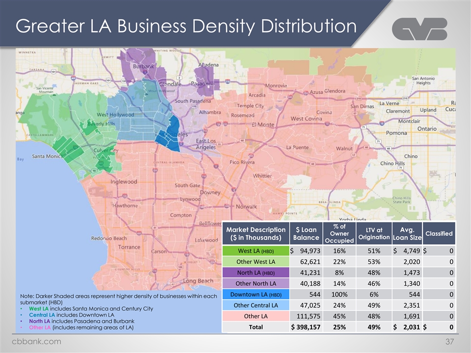 Greater LA Business Density Distribution % of Market Description $ Loan LTV at Avg. Owner Classified Origination ($ in Thousands) Balance Loan Size Occupied West LA (HBD) $ 94,973 16% 51% $ 4,749 $ 0 Other West LA 62,621 22% 53% 2,020 0 North LA (HBD) 41,231 8% 48% 1,473 0 Other North LA 40,188 14% 46% 1,340 0 Downtown LA (HBD) 544 100% 6% 544 0 Note: Darker Shaded areas represent higher density of businesses within each submarket (HBD) Other Central LA 47,025 24% 49% 2,351 0 • West LA includes Santa Monica and Century City • Central LA includes Downtown LA Other LA 111,575 45% 48% 1,691 0 • North LA includes Pasadena and Burbank • Other LA (includes remaining areas of LA) Total $ 398,157 25% 49% $ 2,031 $ 0 cbbank.com 37