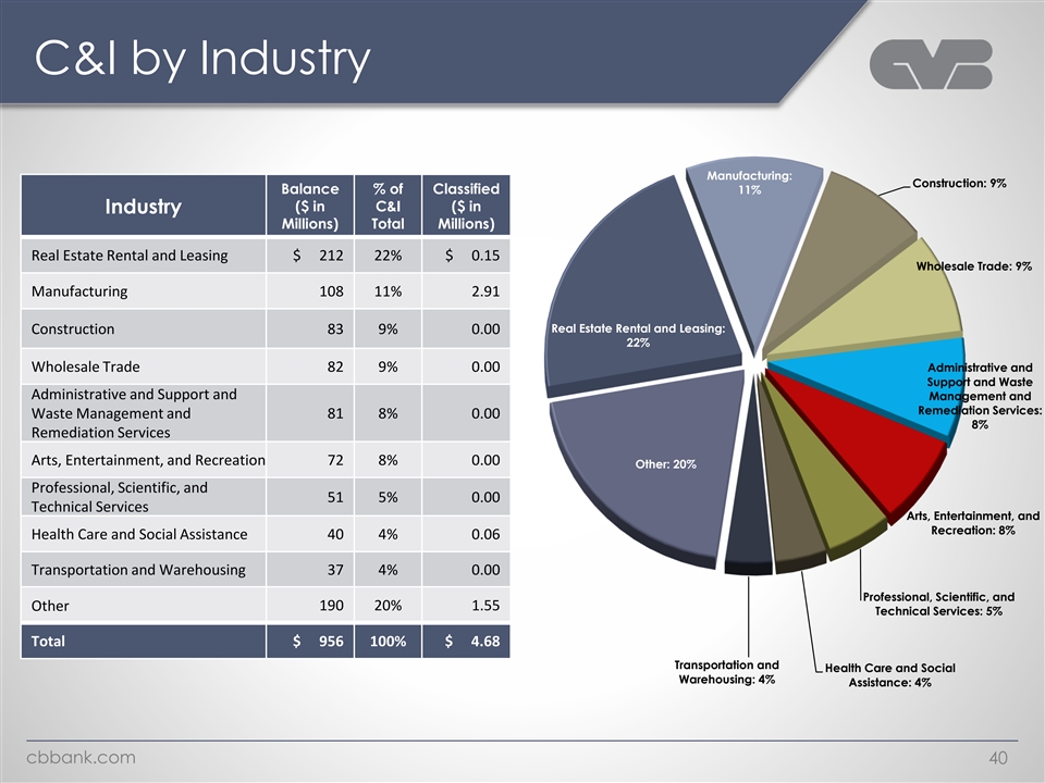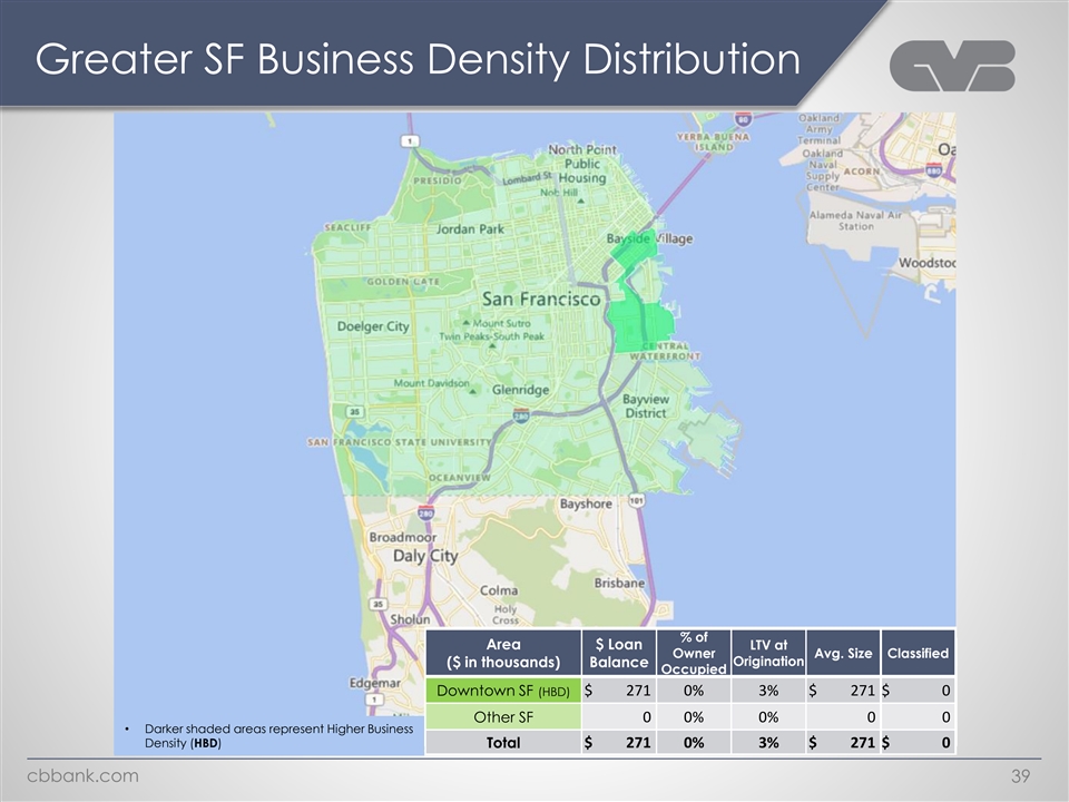 Greater SD Business Density Distribution % of Area $ Loan LTV at Owner Avg. Size Classified Balance Origination ($ in thousands) Occupied Downtown SD (HBD) $ 3,744 41% 54% $ 1,248 $ 0 Other SD 85,599 0% 53% 4,076 0 • Darker shaded areas represent Higher Business Density (HBD) Total $ 89,343 2% 53% $ 3,723 $ 0 cbbank.com 38