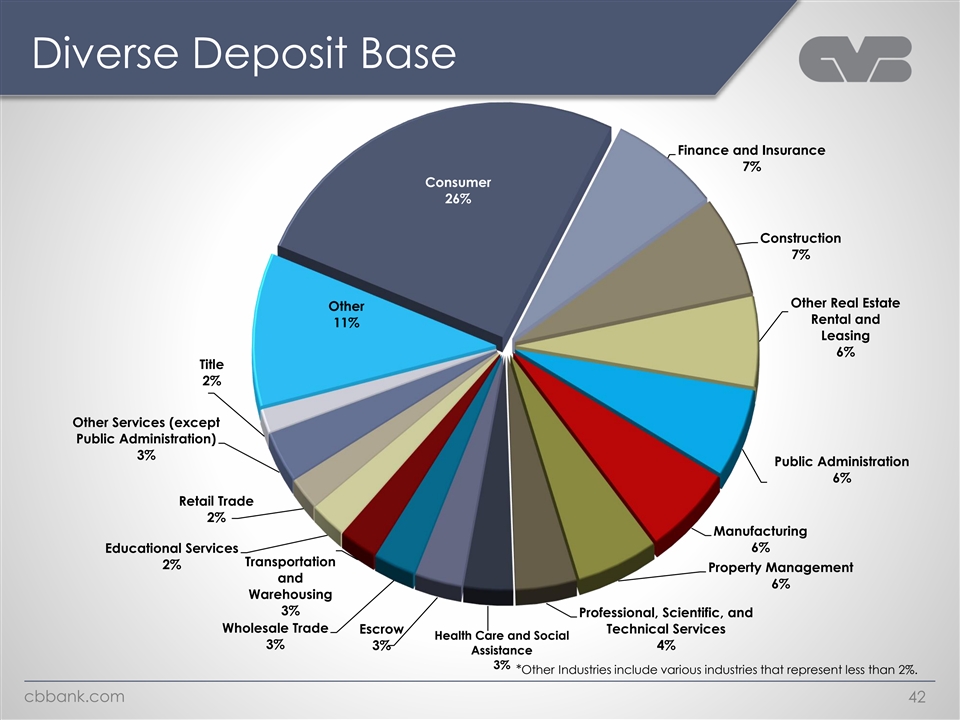 Diverse Deposit Base Finance and Insurance 7% Consumer 26% Construction 7% Other Real Estate Other Rental and 11% Leasing 6% Title 2% Other Services (except Public Administration) 3% Public Administration 6% Retail Trade 2% Manufacturing 6% Educational Services Transportation 2% Property Management and 6% Warehousing 3% Professional, Scientific, and Wholesale Trade Escrow Technical Services Health Care and Social 3% 3% 4% Assistance 3% *Other Industries include various industries that represent less than 2%. cbbank.com 42