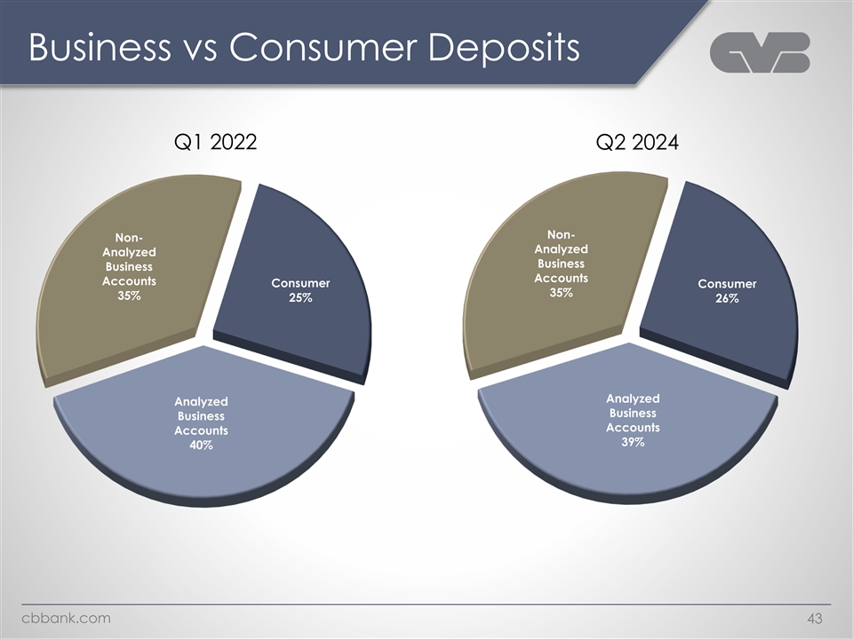 Business vs Consumer Deposits Q1 2022 Q2 2024 Non- Non- Analyzed Analyzed Business Business Accounts Accounts Consumer Consumer 35% 35% 25% 26% Analyzed Analyzed Business Business Accounts Accounts 39% 40% cbbank.com 43