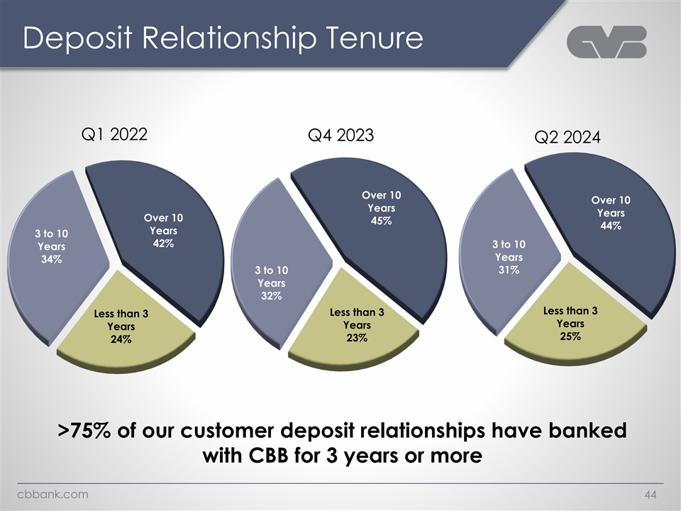 Deposit Relationship Tenure Q1 2022 Q4 2023 Q2 2024 Over 10 Over 10 Years Years Over 10 45% 44% Years 3 to 10 42% 3 to 10 Years Years 34% 31% 3 to 10 Years 32% Less than 3 Less than 3 Less than 3 Years Years Years 25% 23% 24% >75% of our customer deposit relationships have banked with CBB for 3 years or more cbbank.com 44