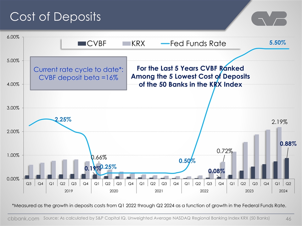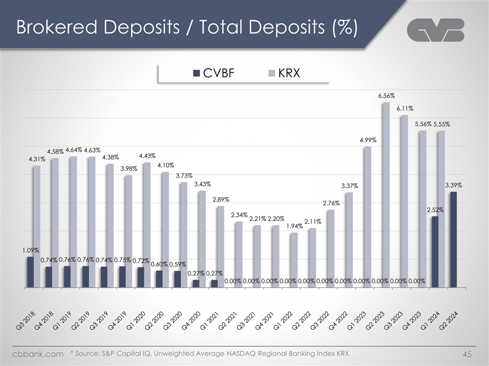 Brokered Deposits / Total Deposits (%) CVBF KRX 6.56% 6.11% 5.56% 5.55% 4.99% 4.64% 4.63% 4.58% 4.43% 4.38% 4.31% 4.10% 3.98% 3.73% 3.43% 3.39% 3.37% 2.89% 2.76% 2.52% 2.34% 2.21% 2.20% 2.11% 1.94% 1.09% 0.76% 0.76% 0.74% 0.74% 0.75% 0.72% 0.60% 0.59% 0.27% 0.27% 0.00% 0.00% 0.00% 0.00% 0.00% 0.00% 0.00% 0.00% 0.00% 0.00% 0.00% * Source: S&P Capital IQ. Unweighted Average NASDAQ Regional Banking Index KRX cbbank.com 45