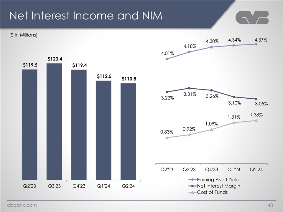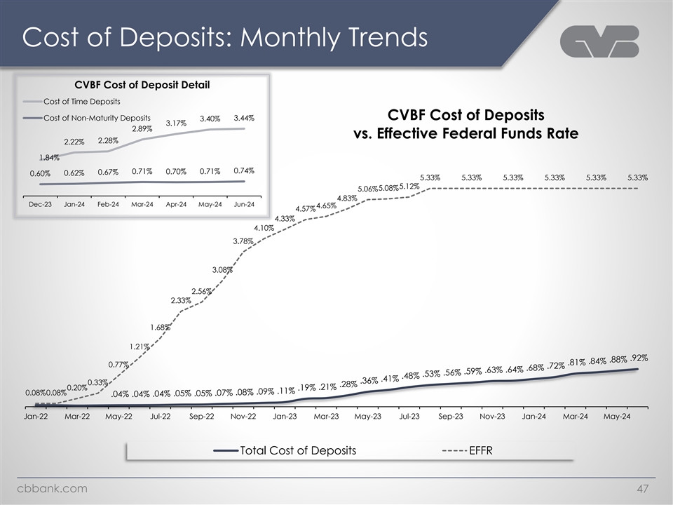 Cost of Deposits: Monthly Trends CVBF Cost of Deposit Detail Cost of Time Deposits Cost of Non-Maturity Deposits 3.44% CVBF Cost of Deposits 3.40% 3.17% 2.89% vs. Effective Federal Funds Rate 2.28% 2.22% 1.84% 0.71% 0.70% 0.71% 0.74% 0.67% 0.60% 0.62% 5.33% 5.33% 5.33% 5.33% 5.33% 5.33% 5.12% 5.08% 5.06% 4.83% Dec-23 Jan-24 Feb-24 Mar-24 Apr-24 May-24 Jun-24 4.65% 4.57% 4.33% 4.10% 3.78% 3.08% 2.56% 2.33% 1.68% 1.21% .92% .88% .84% .81% 0.77% .72% .68% .64% .63% .59% .56% .53% .48% .41% .36% 0.33% .28% .21% 0.20% .19% .11% .09% 0.08%0.08% .07% .08% .04% .05% .05% .04% .04% Jan-22 Mar-22 May-22 Jul-22 Sep-22 Nov-22 Jan-23 Mar-23 May-23 Jul-23 Sep-23 Nov-23 Jan-24 Mar-24 May-24 Total Cost of Deposits EFFR cbbank.com 47