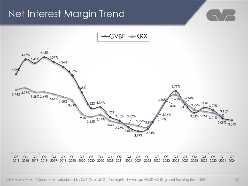 Net Interest Margin Trend CVBF KRX 4.48% 4.43% 4.37% 4.34% 4.26% 4.09% 4.06% 3.71% 3.68% 3.78% 3.74% 3.69% 3.69% 3.45% 3.64% 3.63% 3.50% 3.58% 3.34% 3.33% 3.32% 3.49% 3.29% 3.27% 3.48% 3.41% 3.15% 3.12% 3.16% 3.25% 3.03% 2.96% 3.21% 3.21% 3.20% 3.17% 3.14% 2.92% 3.12% 2.89% 3.09% 3.04% 3.04% 2.98% 2.88% 2.84% 2.79% Q3 Q4 Q1 Q2 Q3 Q4 Q1 Q2 Q3 Q4 Q1 Q2 Q3 Q4 Q1 Q2 Q3 Q4 Q1 Q2 Q3 Q4 Q1 Q2 2018 2018 2019 2019 2019 2019 2020 2020 2020 2020 2021 2021 2021 2021 2022 2022 2022 2022 2023 2023 2023 2023 2024 2024 * Source: As calculated by S&P Capital IQ. Unweighted Average NASDAQ Regional Banking Index KRX cbbank.com 49