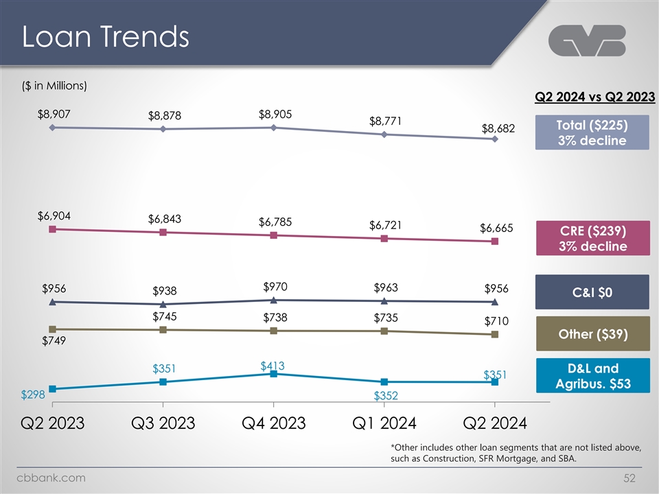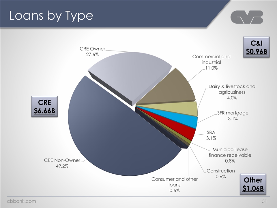 Loans by Type C&I CRE Owner $0.96B 27.6% Commercial and industrial 11.0% Dairy & livestock and agribusiness 4.0% CRE $6.66B SFR mortgage 3.1% SBA 3.1% Municipal lease finance receivable CRE Non-Owner 0.8% 49.2% Construction 0.6% Consumer and other Other loans $1.06B 0.6% cbbank.com 51