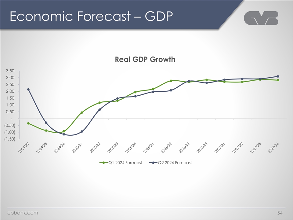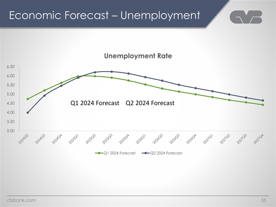 Economic Forecast – GDP Real GDP Growth 3.50 3.00 2.50 2.00 1.50 1.00 0.50 - (0.50) (1.00) (1.50) Q1 2024 Forecast Q2 2024 Forecast cbbank.com 54