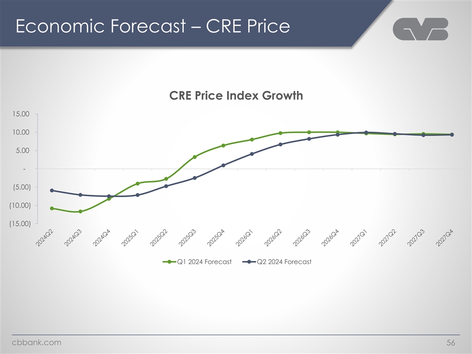 Economic Forecast – CRE Price CRE Price Index Growth 15.00 10.00 5.00 - (5.00) (10.00) (15.00) Q1 2024 Forecast Q2 2024 Forecast cbbank.com 56