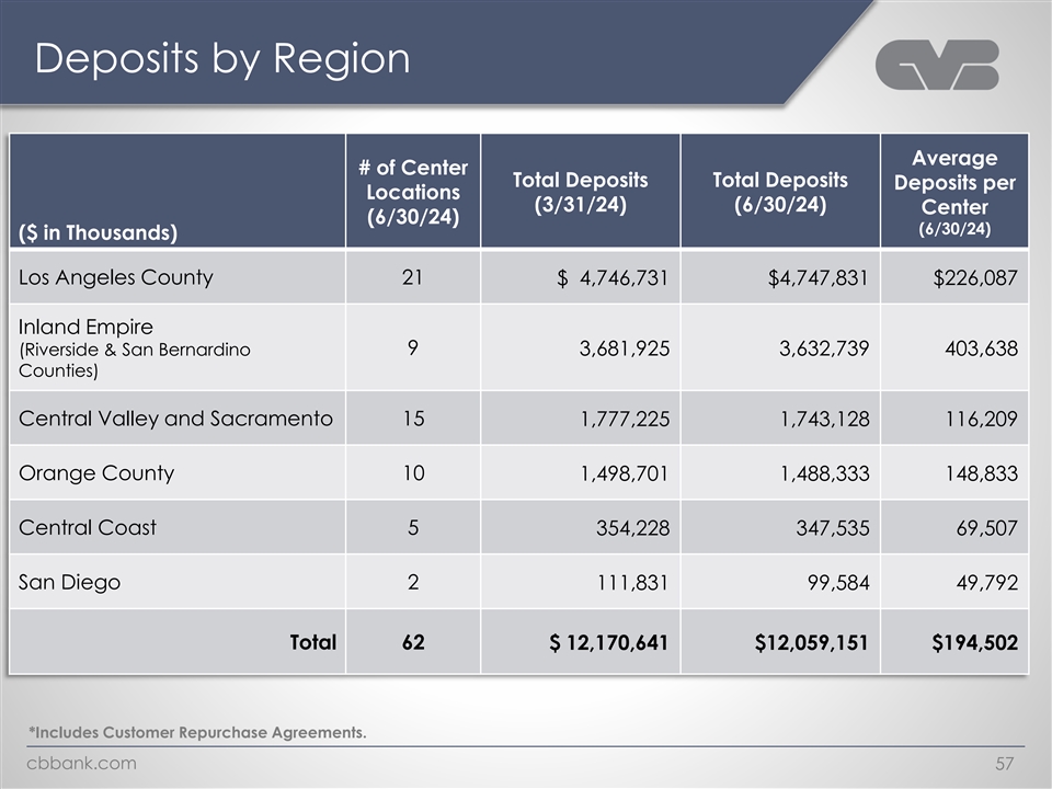 Deposits by Region Average # of Center Total Deposits Total Deposits Deposits per Locations (3/31/24) (6/30/24) Center (6/30/24) (6/30/24) ($ in Thousands) Los Angeles County 21 $ 4,746,731 $4,747,831 $226,087 Inland Empire 9 (Riverside & San Bernardino 3,681,925 3,632,739 403,638 Counties) Central Valley and Sacramento 15 1,777,225 1,743,128 116,209 Orange County 10 1,498,701 1,488,333 148,833 Central Coast 5 354,228 347,535 69,507 San Diego 2 111,831 99,584 49,792 Total 62 $ 12,170,641 $12,059,151 $194,502 *Includes Customer Repurchase Agreements. cbbank.com 57