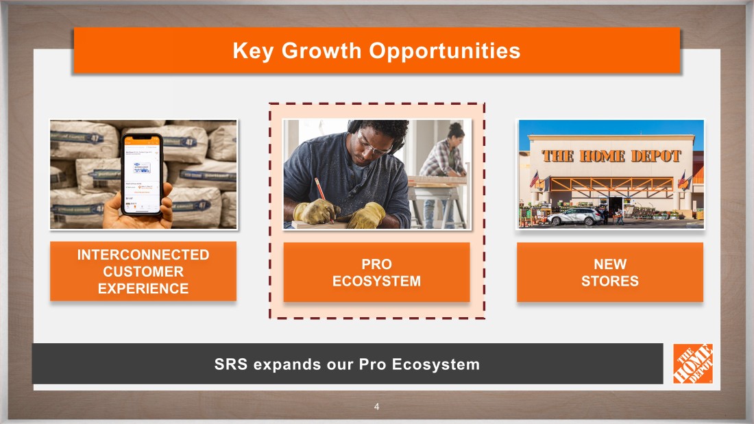 CONFIDENTIAL Forward Looking Statements and Non - GAAP Financial Measures Certain statements contained herein constitute "forward - looking statements" as defined in the Private Securities Litigation Reform Act of 1995 . Forward - looking statements may relate to, among other things, the proposed acquisition of SRS Distribution Inc . , which involves substantial risks and uncertainties that could cause actual results to differ materially from those expressed or implied by such statements (the “potential acquisition”) ; statements about the potential benefits of the potential acquisition ; the anticipated timing of closing of the potential acquisition (including failure to obtain necessary regulatory approvals) and the possibility that the potential acquisition does not close ; risks related to the ability to realize the anticipated benefits of the potential acquisition, including the possibility that the expected benefits from the proposed transaction will not be realized or will not be realized within the expected time period ; the risk that the businesses will not be integrated successfully ; disruption from the potential acquisition making it more difficult to maintain business and operational relationships ; negative effects of announcing the potential acquisition or the consummation of the potential acquisition on the market price of our common stock, credit ratings or operating results ; significant costs associated with the potential acquisition ; unknown liabilities ; the risk of litigation and/or regulatory actions related to the potential acquisition ; the demand for our products and services, including as a result of macroeconomic conditions ; net sales growth ; comparable sales ; the effects of competition ; our brand and reputation ; implementation of interconnected retail, store, supply chain and technology initiatives ; inventory and in - stock positions ; the state of the economy ; the state of the housing and home improvement markets ; the state of the credit markets, including mortgages, home equity loans, and consumer credit ; the impact of tariffs ; issues related to the payment methods we accept ; demand for credit offerings ; management of relationships with our associates, potential associates, suppliers and service providers ; cost and availability of labor ; costs of fuel and other energy sources ; events that could disrupt our business, supply chain, technology infrastructure, or demand for our products and services, such as international trade disputes, natural disasters, climate change, public health issues, cybersecurity events, geopolitical conflicts, military conflicts, or acts of war ; our ability to maintain a safe and secure store environment ; our ability to address expectations regarding environmental, social and governance matters and meet related goals ; continuation or suspension of share repurchases ; net earnings performance ; earnings per share ; future dividends ; capital allocation and expenditures ; liquidity ; return on invested capital ; expense leverage ; changes in interest rates ; changes in foreign currency exchange rates ; commodity or other price inflation and deflation ; our ability to issue debt on terms and at rates acceptable to us ; the impact and expected outcome of investigations, inquiries, claims, and litigation, including compliance with related settlements ; the challenges of operating in international markets ; the adequacy of insurance coverage ; the effect of accounting charges ; the effect of adopting certain accounting standards ; the impact of legal and regulatory changes, including changes to tax laws and regulations ; store openings and closures ; guidance for fiscal 2024 and beyond ; financial outlook ; and the impact of acquired companies on our organization and the ability to recognize the anticipated benefits of any acquisitions . Forward - looking statements are based on currently available information and our current assumptions, expectations and projections about future events . You should not rely on our forward - looking statements . These statements are not guarantees of future performance and are subject to future events, risks and uncertainties – many of which are beyond our control, dependent on the actions of third parties, or currently unknown to us – as well as potentially inaccurate assumptions that could cause actual results to differ materially from our historical experience and our expectations and projections . These risks and uncertainties include, but are not limited to, those described in Part I, Item 1 A, "Risk Factors," and elsewhere in our Annual Report on Form 10 - K for our fiscal year ended January 28 , 2024 and also as may be described from time to time in future reports we file with the Securities and Exchange Commission . There also may be other factors that we cannot anticipate or that are not described herein, generally because we do not currently perceive them to be material . Such factors could cause results to differ materially from our expectations . Forward - looking statements speak only as of the date they are made, and we do not undertake to update these statements other than as required by law . You are advised, however, to review any further disclosures we make on related subjects in our filings with the Securities and Exchange Commission and in our other public statements . Today’s presentations are also supplemented with certain non - GAAP financial measures . We believe these non - GAAP financial measures better enable management and investors to understand and analyze our performance . However, this supplemental information should not be considered in isolation or as a substitute for the related GAAP measures . Reconciliations of the supplemental information to the comparable GAAP measures can be found in the Appendix of this presentation and on our Investor Relations website at ir . homedepot . com . 2